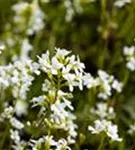 Arabis procurrens 'Glacier' bildet radförmige, in Trauben angeordnete, weiße Blüten ab April.