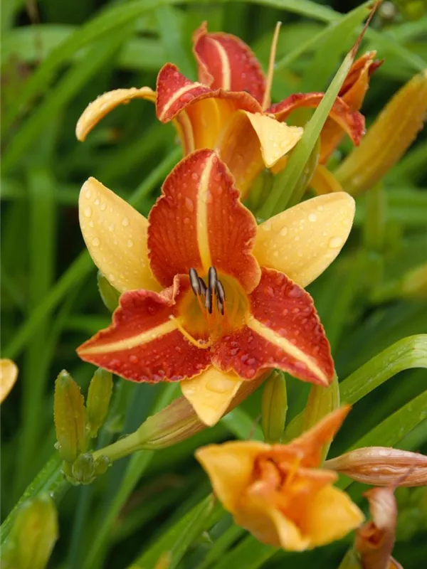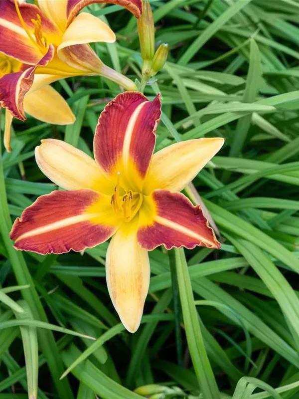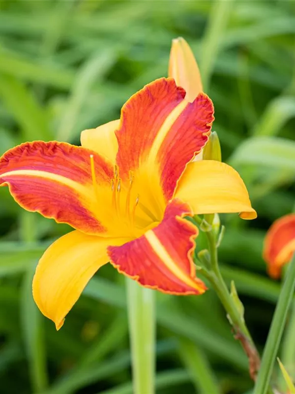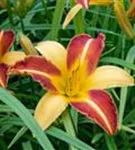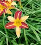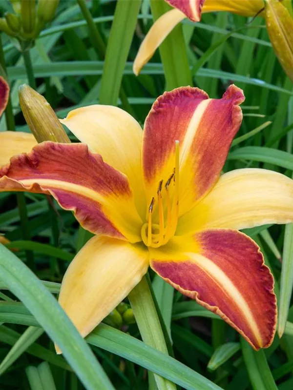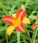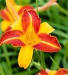 Hemerocallis 'Frans Hals' bildet trichterförmige, gelb-rote Blüten ab Juli.