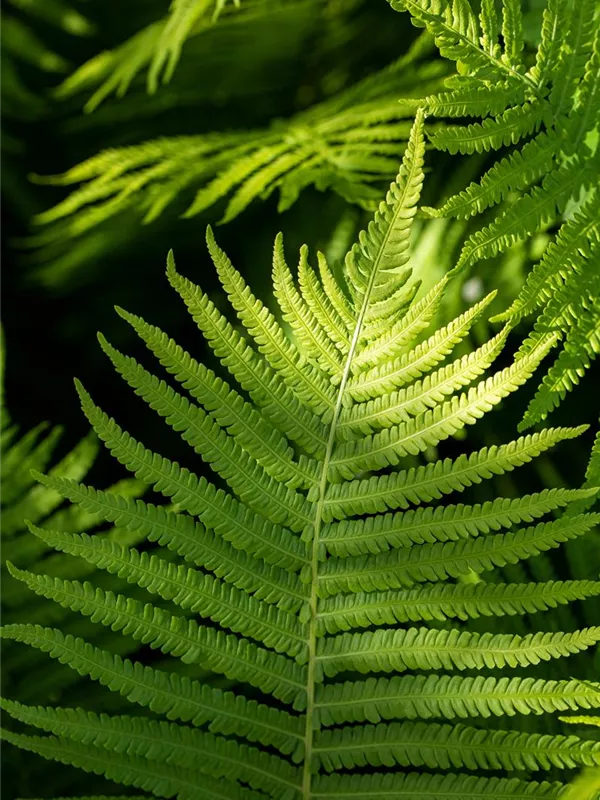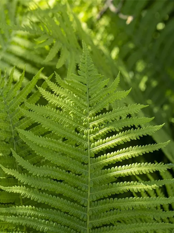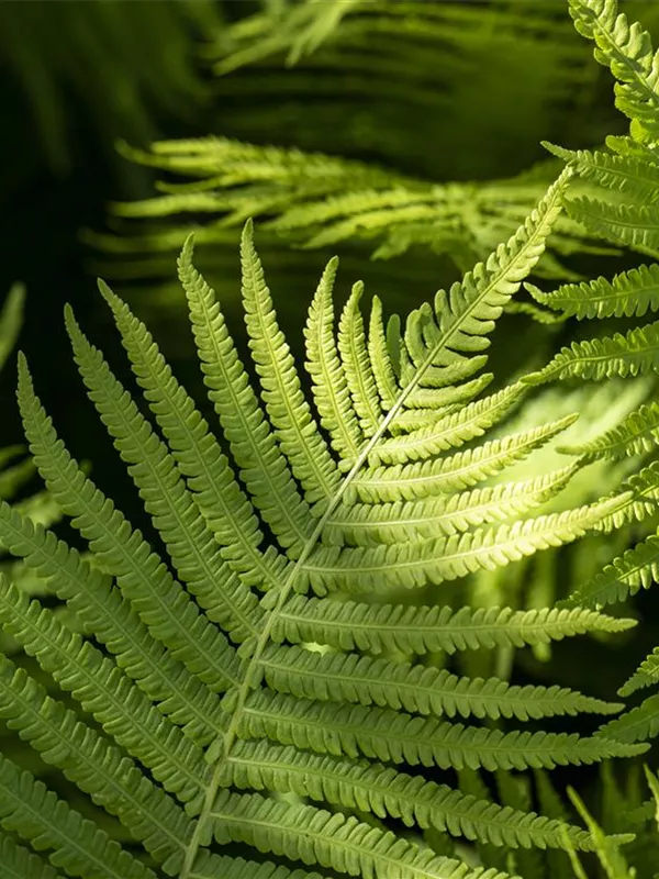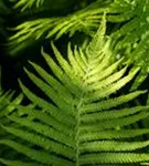 Hoher Blattschmuckwert. Die wintergrünen Blätter des Rotschleierfarns sind mittelgrün, gefiedert. Kupferbrauner Austrieb.
