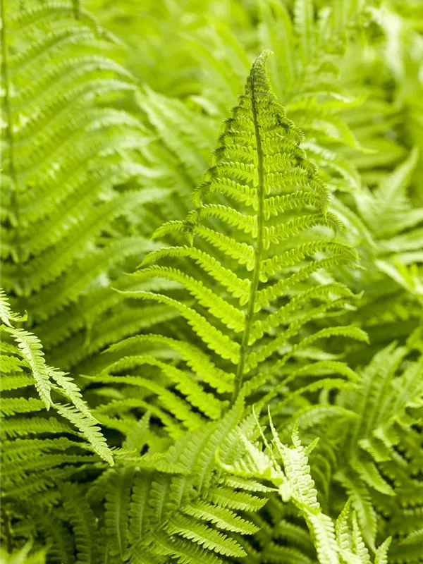 Hoher Blattschmuckwert. Die sommergrünen Blätter des Wald-Frauenfarns sind hellgrün, gefiedert.