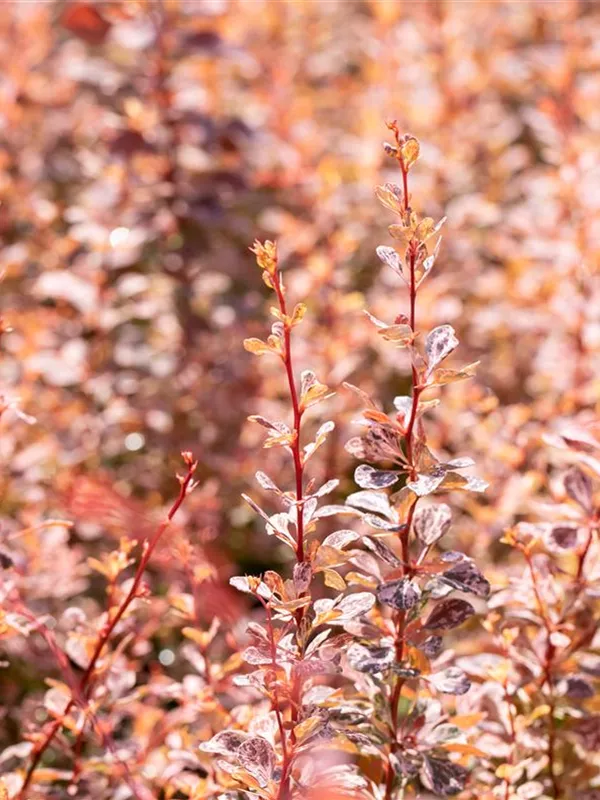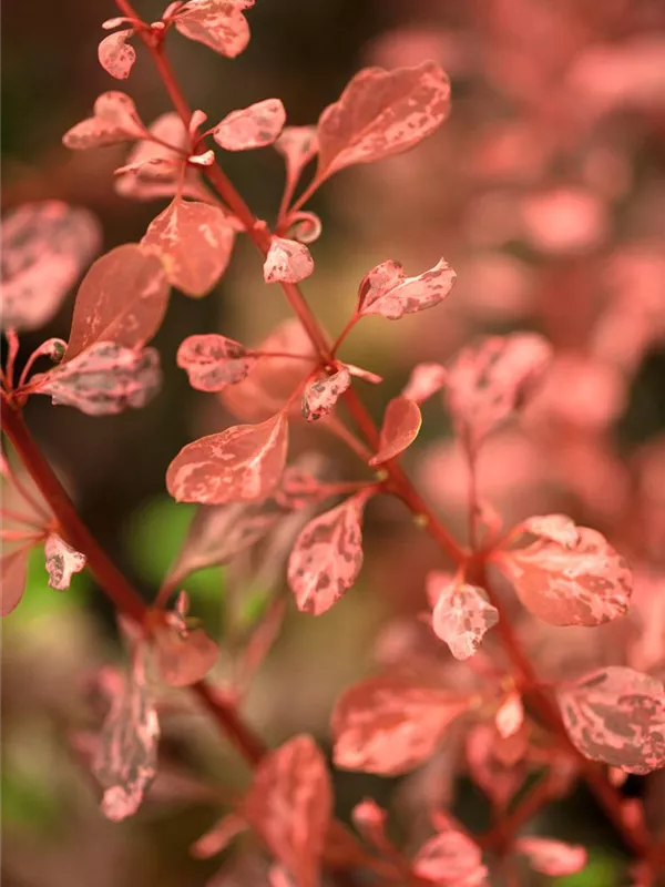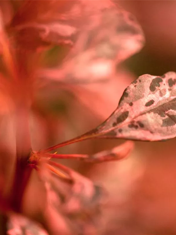 Hoher Blattschmuckwert. Die sommergrünen Blätter der Berberitze 'Rose Glow' sind panaschiert, rot-weiß, eiförmig, wechselständig. Diese sind etwa 2 - 3 cm groß. Blutroter Austrieb. Berberitze 'Rose Glow' zeigt sich leuchtend rot-orange im Herbst.