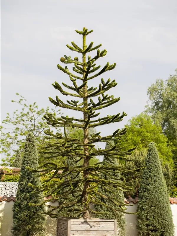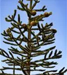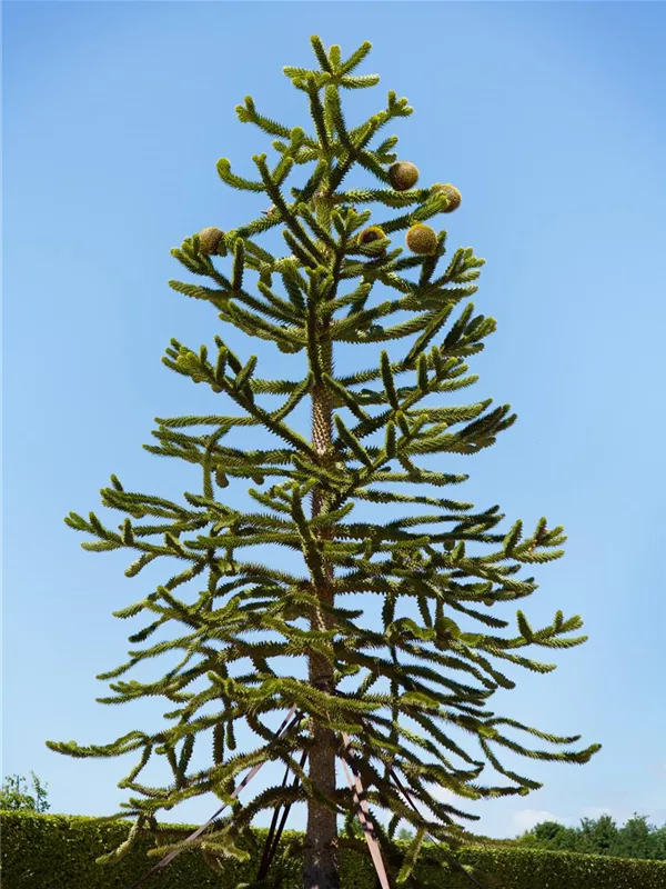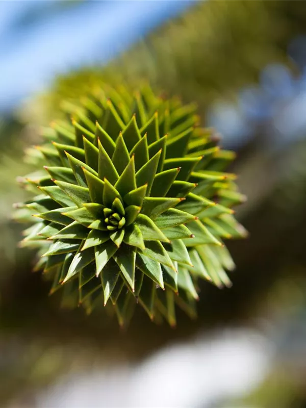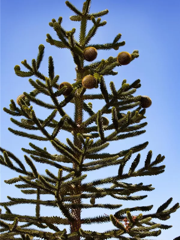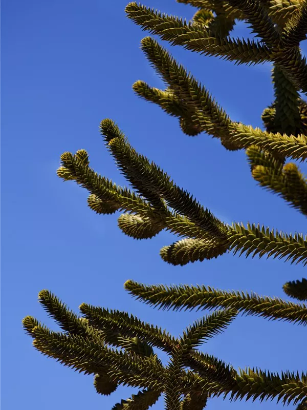 Sehr dekorativ. Die Andentanne ist immergrün. Ihre Nadeln sind dunkelgrün, glänzend, ledrig, dreieckig.