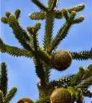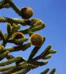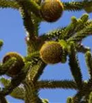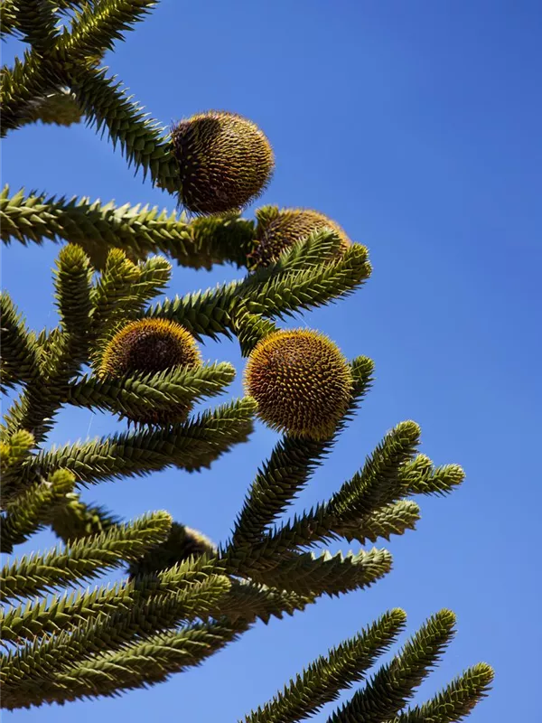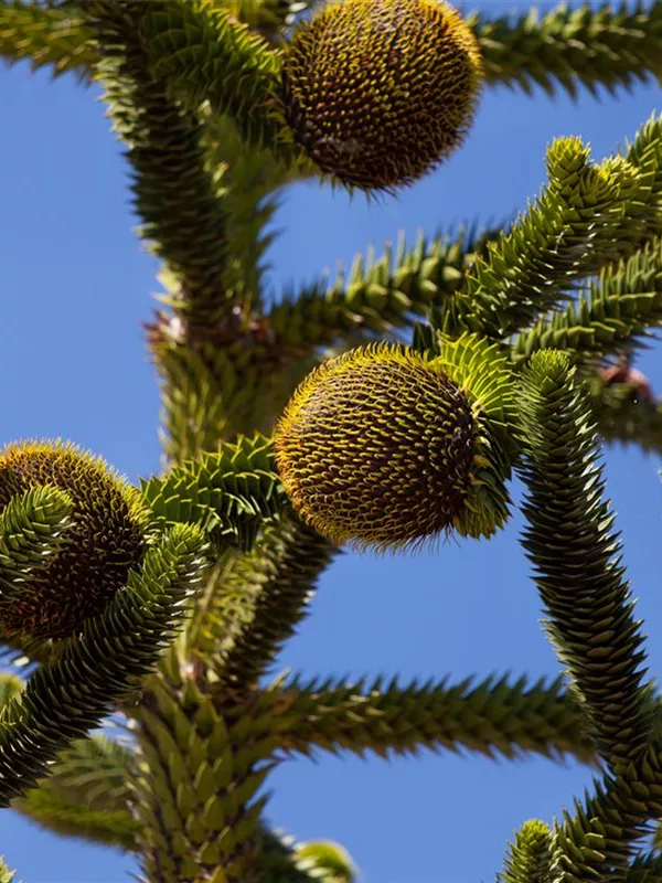 Die braunen Zapfen von Araucaria araucana sind sehr groß. Die jungen Zapfen haben eine bernsteingelbe Färbung.