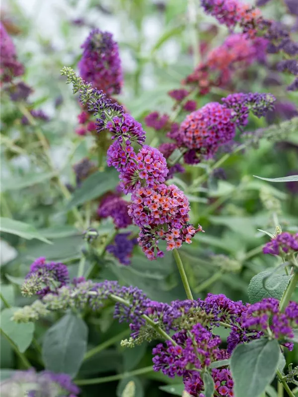 Die blau-orangen Blüten des Sommerflieder 'Bicolor' erscheinen in Rispen von Juli bis September. Diese sind stark duftend.