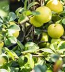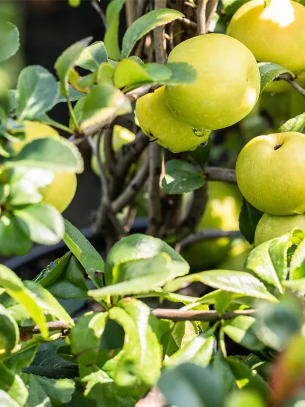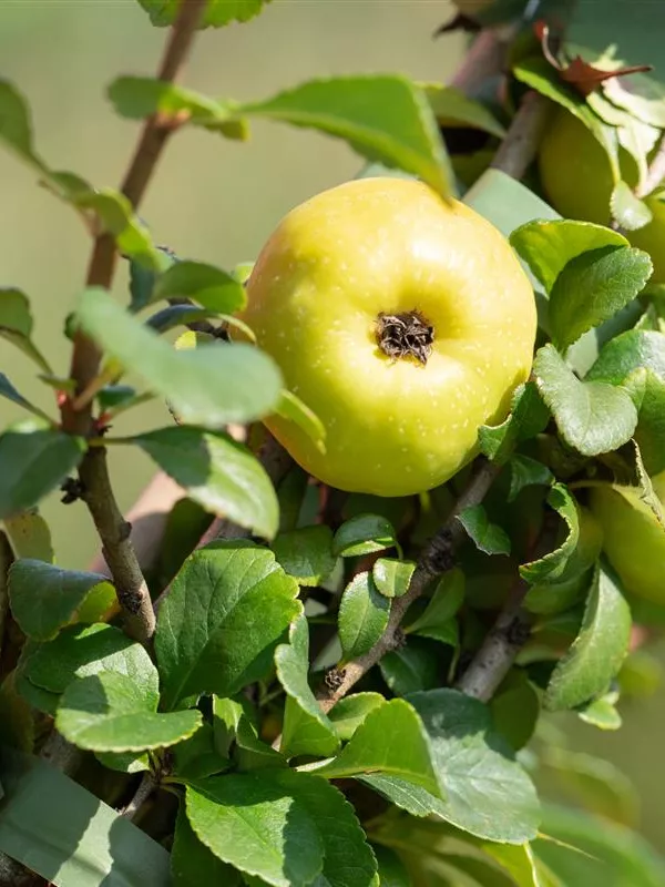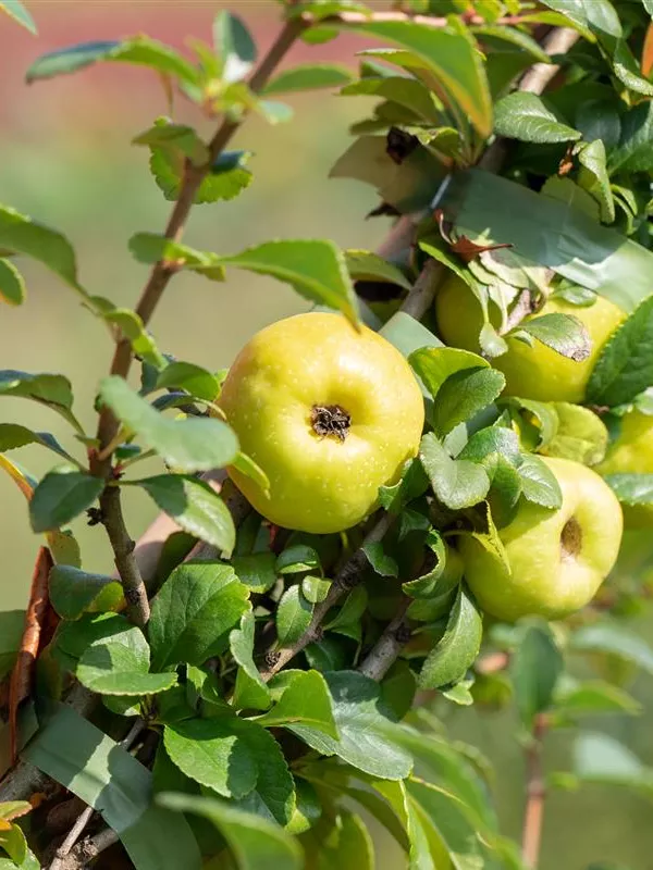 Besonders dekorativ sind die gelben, orangefarbenen, angenehm duftenden, birnenförmigen Früchte von Chaenomeles japonica 'Sargentii'. Diese erscheinen ab September.