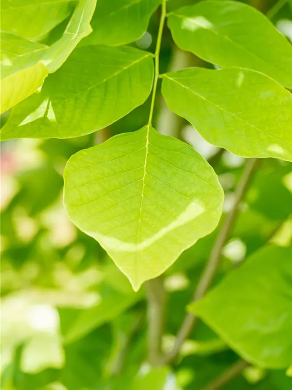 Die sommergrünen Blätter des Amerikanischen Gelbholzes sind hellgrün, eiförmig, gefiedert. Amerikanisches Gelbholz zeigt sich leuchtend gelb im Herbst.