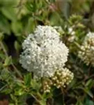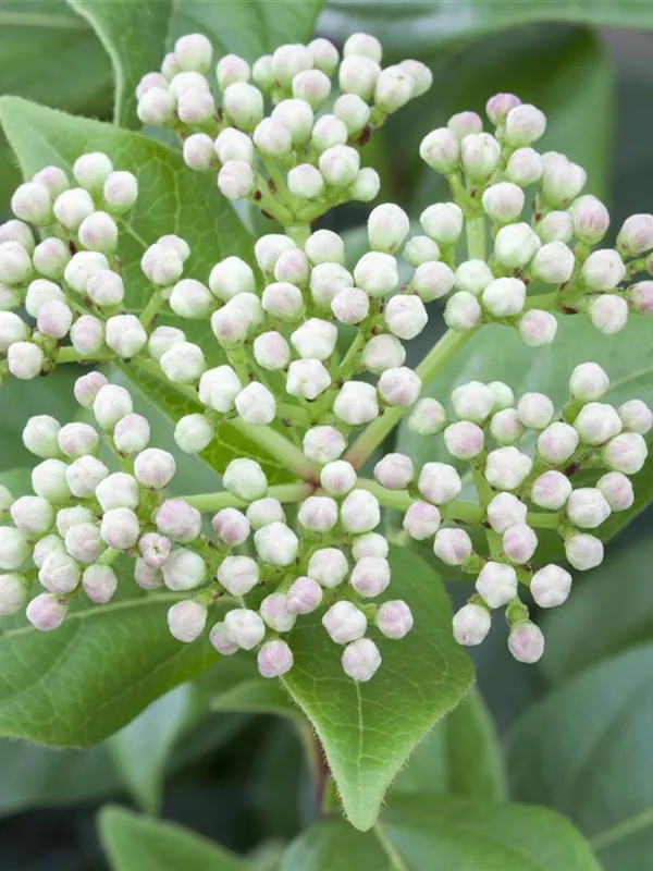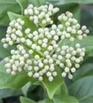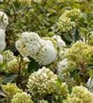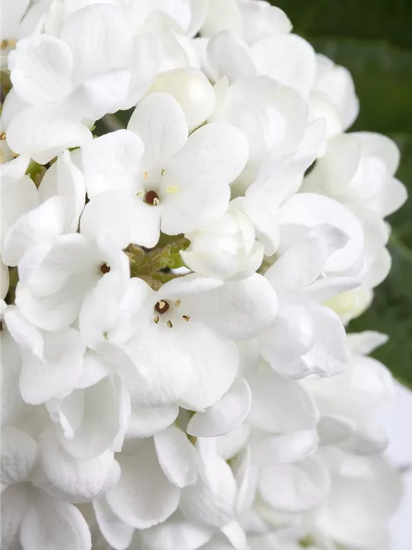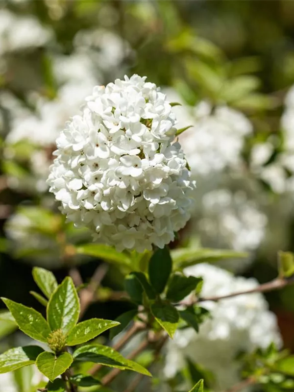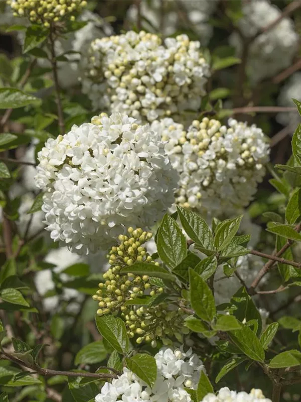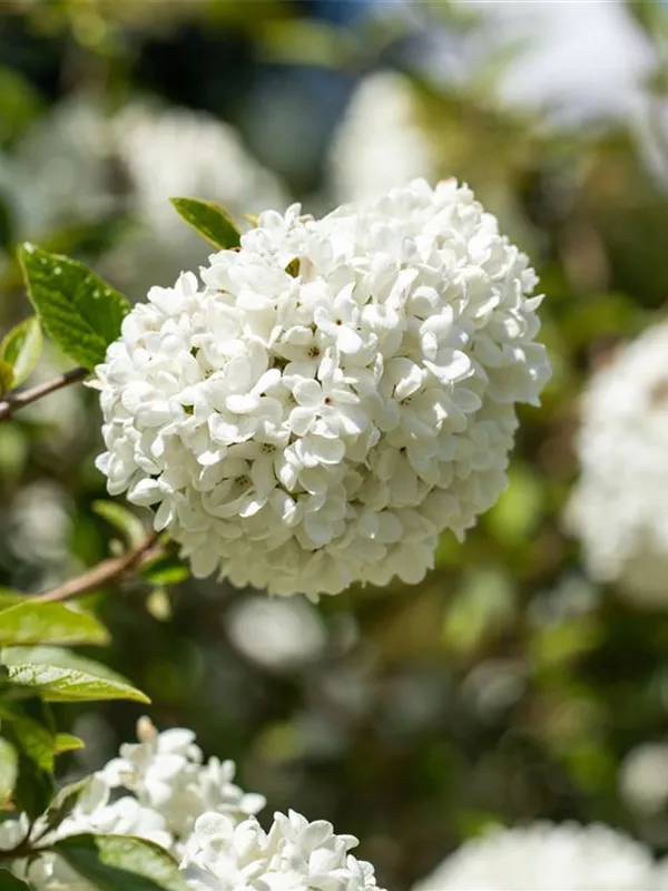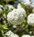Die cremeweißen Blüten des Schneeball 'Eskimo' erscheinen in Trugdolden von April bis Mai. Diese sind stark duftend. Bei richtiger Pflege Nachblüte im Oktober.