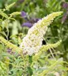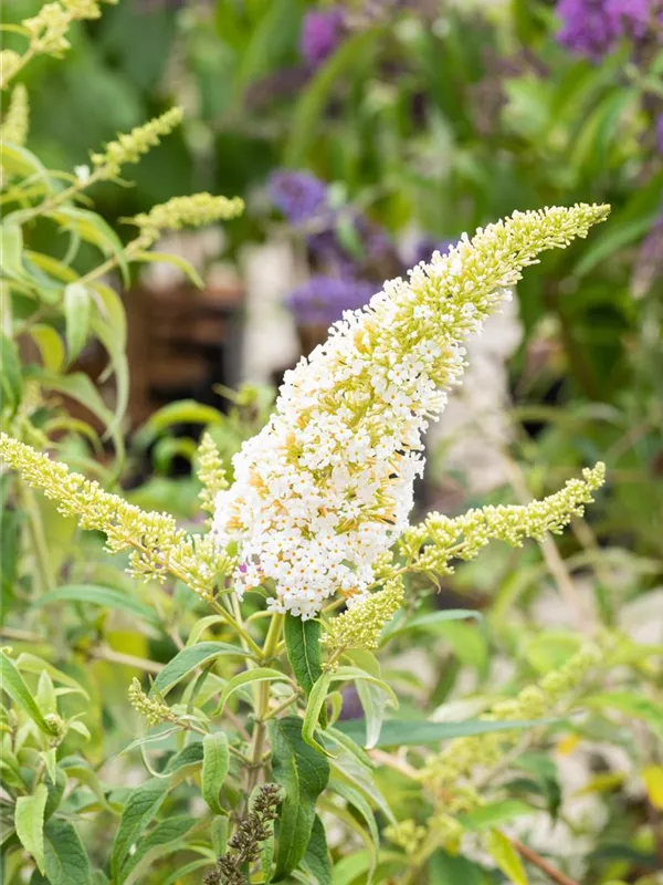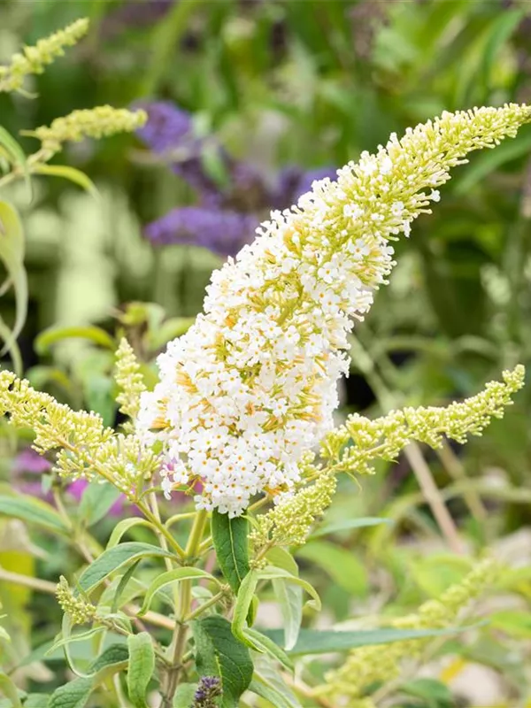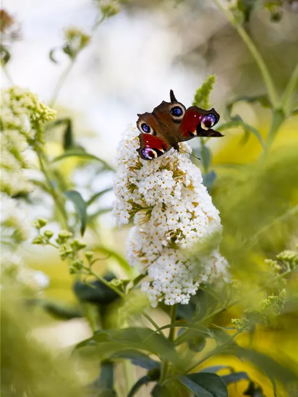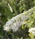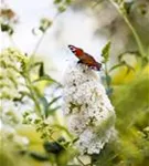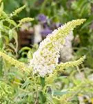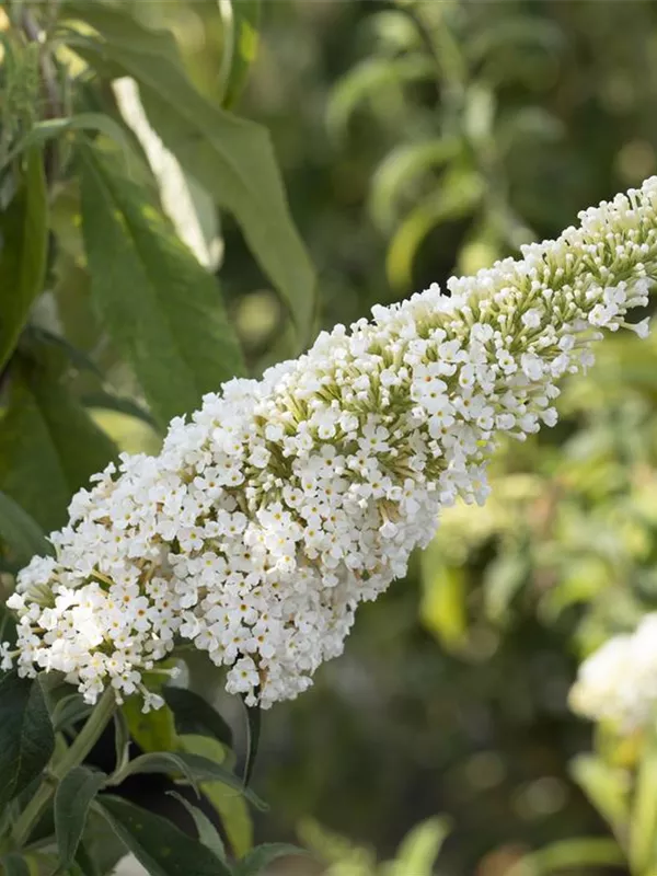 Die weißen Blüten des Sommerflieder 'Peace' erscheinen in Rispen von Juli bis September. Diese sind stark duftend.