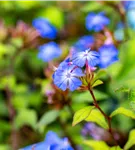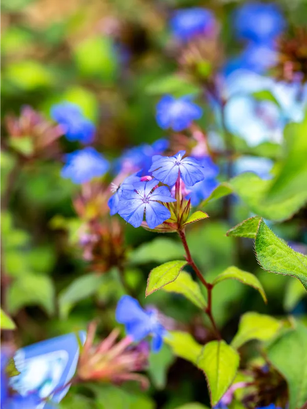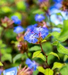 Ceratostigma willmottianum bildet radförmige, blaue Blüten ab August.