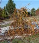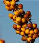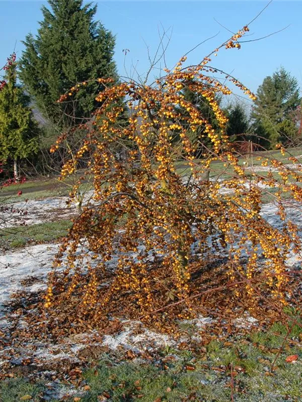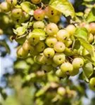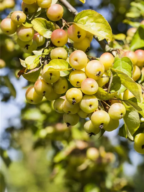 Besonders dekorativ sind die gelben, runden Früchte von Malus 'Butterball'. Diese erscheinen ab Oktober. Haften sehr lange.