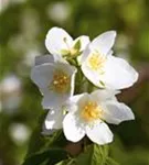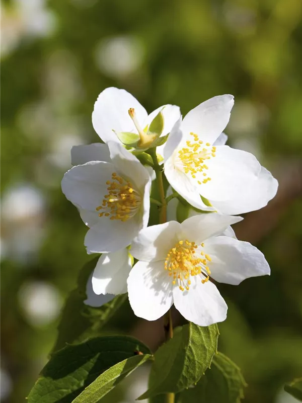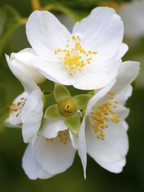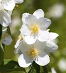 Die weißen, schalenförmigen Blüten des Duftender Bauernjasmin erscheinen in Trauben von Mai bis Juni. Diese sind stark duftend.