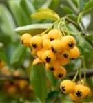 Besonders dekorativ sind die goldgelben, runden Früchte von Pyracantha coccinea 'Sunny Star'. Diese erscheinen ab Juli. Haften sehr lange.