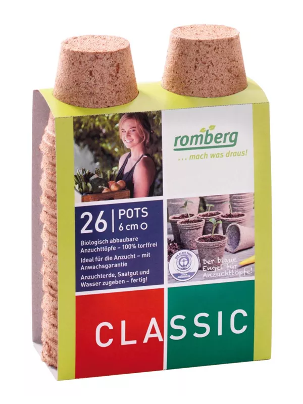 Romberg Anzuchttöpfe sind 100% torffrei und aus Zellulose hergestellt. Sie eigenen sich insbesondere für den Einsatz in Zimmergewächshäusern. Die Töpfe ermöglichen eine leichte Durchwurzelung. Es entsteht kein Umpflanzschock, da die Jungpflanzen mit dem Topf ausgepflanzt werden. Nach dem Auspflanzen zersetzt sich der Anzuchttopf biologisch.