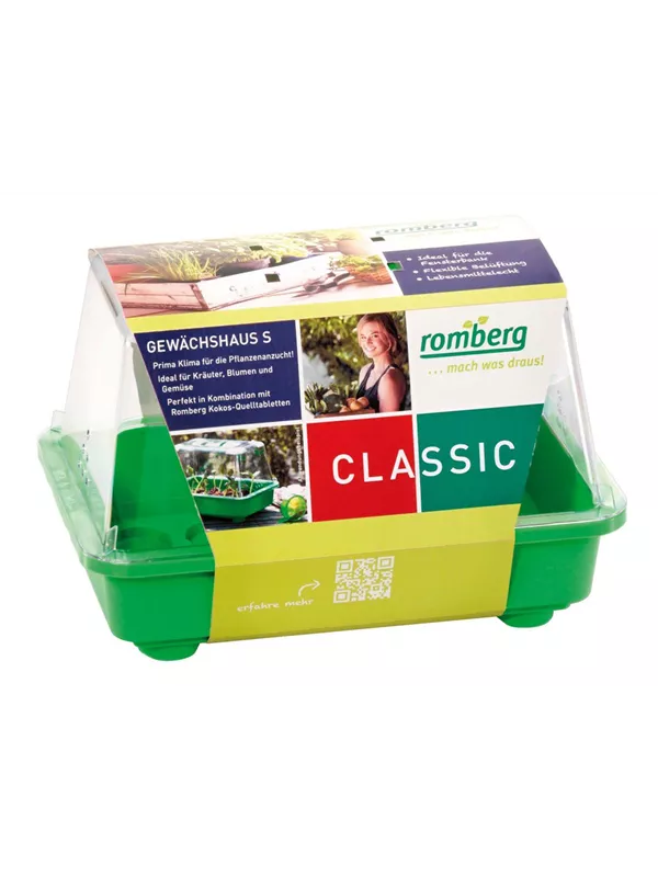 Gewächshäuser von Romberg bieten Pflanzen die richtigen Bedingungen für Licht, Wärme und Feuchtigkeit. Sie sind aus PAK-freiem Kunststoff und lebensmittelecht. Regler und zusätzliche Löcher in der Haube sorgen für eine gute Belüftung sowie Rinnen in der Schale für eine optimale Wasserverteilung. Zudem läuft das Kondenswasser von der Haube zurück in die Schale und nicht auf die Fensterbank. Perfekt in Kombination mit Romberg Kokos-Quelltabletten oder Anzuchttöpfen. Mit den Romberg Gewächshäusern kann jeder Zuhause Kräuter, Blumen und Gemüse anziehen: einfach das gewählte Gewächshaus entweder mit Romberg Quelltabletten oder Anzuchttöpfen plus Substrat füllen. Anschließend Samen oder Setzlinge nach den jeweiligen pflanzenspezifischen Anforderungen (Einsetztiefe kann variieren) in das Substrat einsetzen. Für eine gute Substratdurchfeuchtung sorgen und Haube aufsetzen. Regelmäßiges Lüften und Bewässern nicht vergessen. Bei Bedarf für zusätzliche Wärme und Beleuchtung sorgen.
