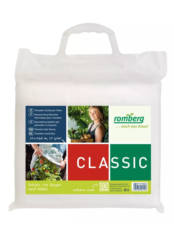 Das große Romberg Tomaten-Schlauch-Vlies sorgt für für optimale Ernte-Ergebnisse. Es wird als Schlauch über die Pflanze gestülpt und am Tomatenpfahl fest zugebunden. So stehen die Pflanzen wie in einem Kleingewächshaus und sind vor Regen, Sturm und Kälte sicher geschützt.