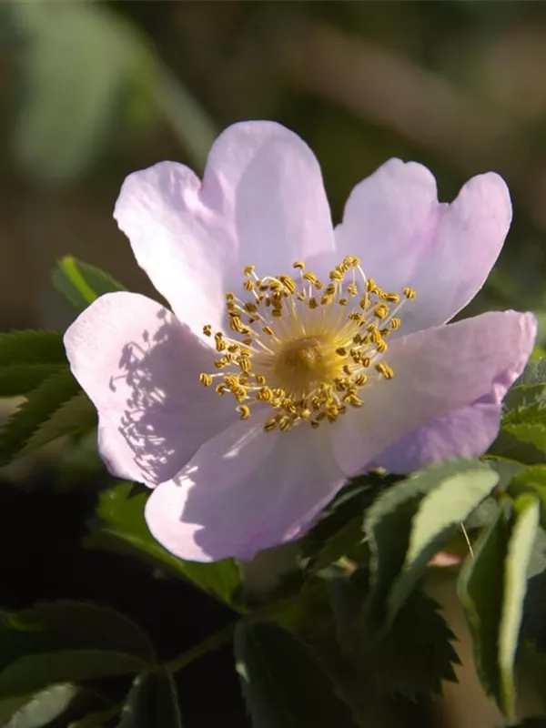 Die sommergrünen Blätter der Pillnitzer Vitaminrose 'PiRo3' sind dunkelgrün, gefiedert, wechselständig.
