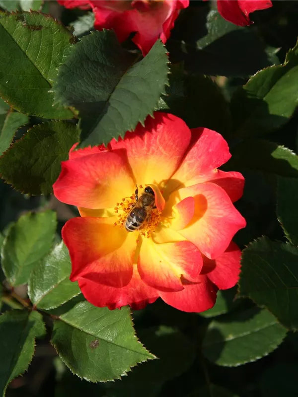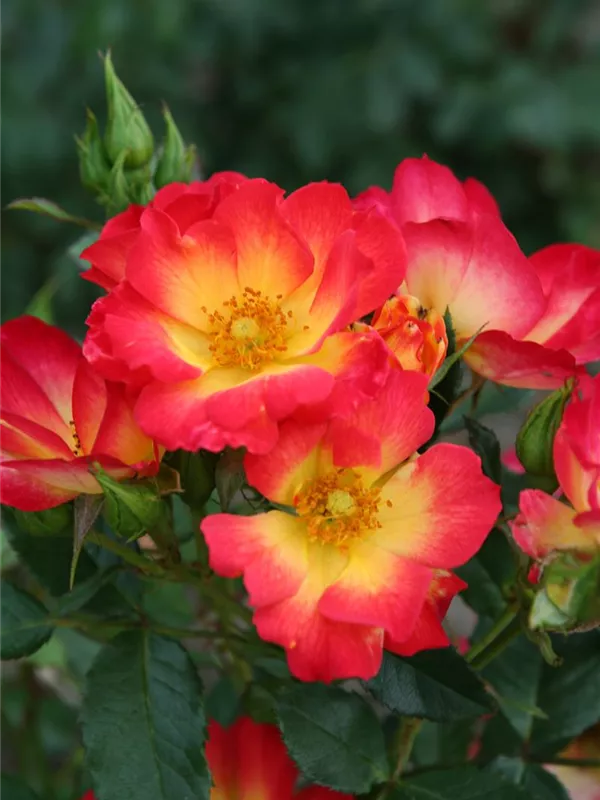 Die sommergrünen Blätter der Rose 'Summer of Love'® sind dunkelgrün, gefiedert, wechselständig.