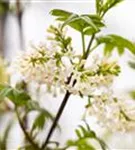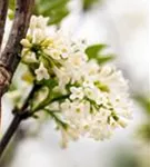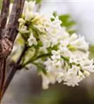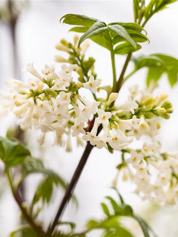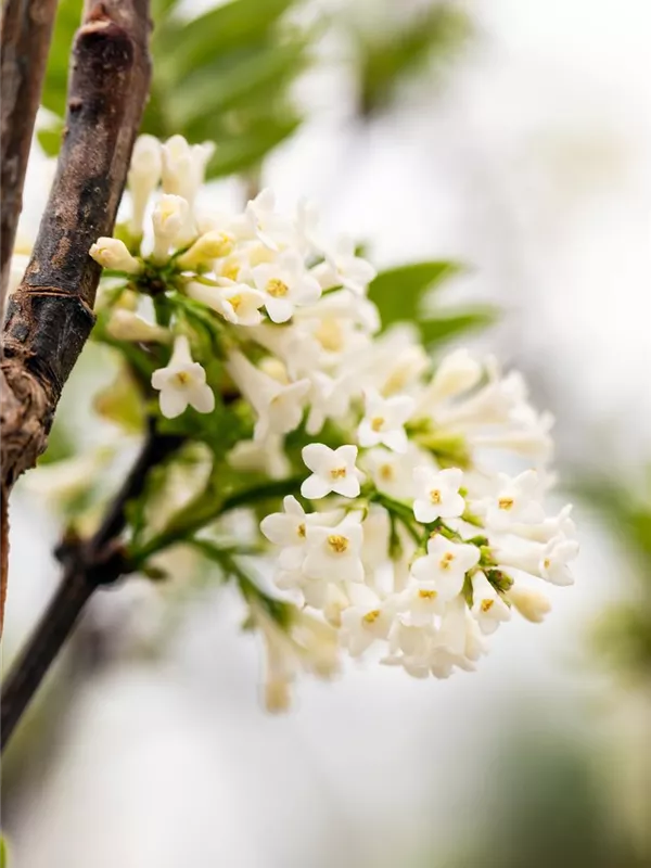 Die weißen, trichterförmigen Blüten des Fiederblättrigen Flieder erscheinen in Rispen von März bis April.