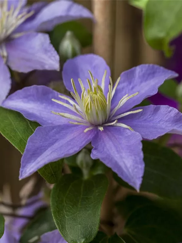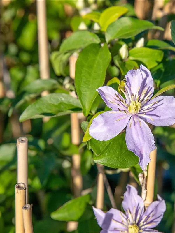 Die sommergrünen Blätter der Waldrebe 'Justa' sind mittelgrün, gefiedert.