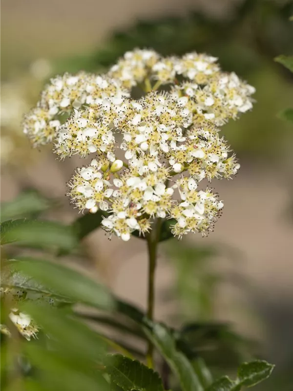 Die weißen Blüten der Eberesche 'Joseph Rock' erscheinen in Dolden von Mai bis Juni.