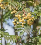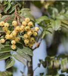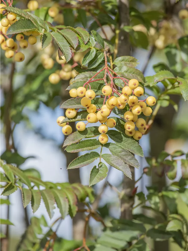 Besonders dekorativ sind die bernsteingelben Früchte von Sorbus 'Joseph Rock'. Diese erscheinen ab Ende September. Haften sehr lange.