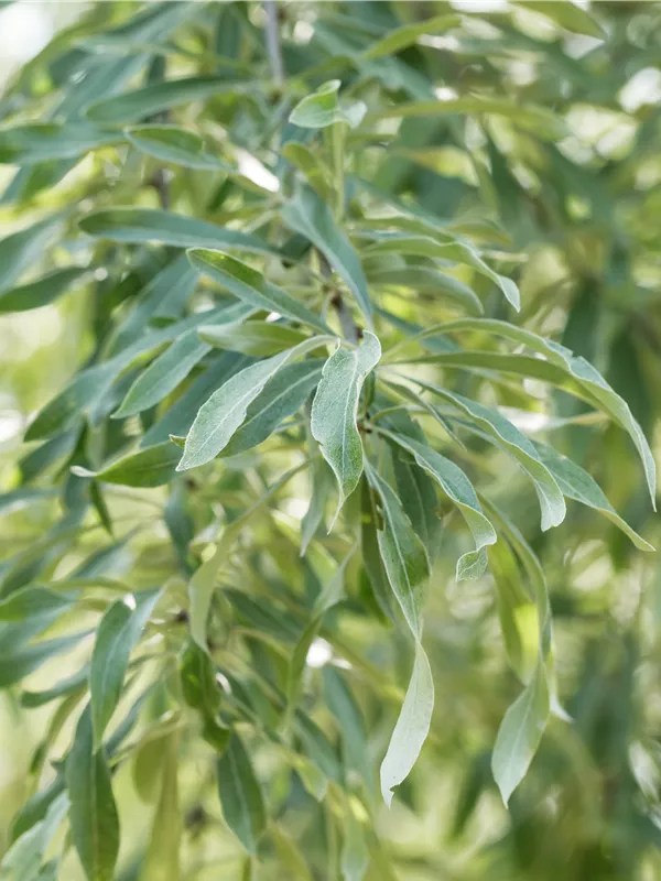 Hoher Blattschmuckwert. Die sommergrünen Blätter der Hängende Wildbirne 'Pendula' sind silbergrau, lanzettlich, matt, wechselständig. Diese sind etwa 5 - 6 cm groß. Hängende Wildbirne 'Pendula' zeigt sich leuchtend gelb im Herbst. Lange haftend.