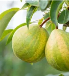 Pyrus communis 'Schweizer Hose' bildet gelb-grüne, gestreifte Früchte.