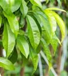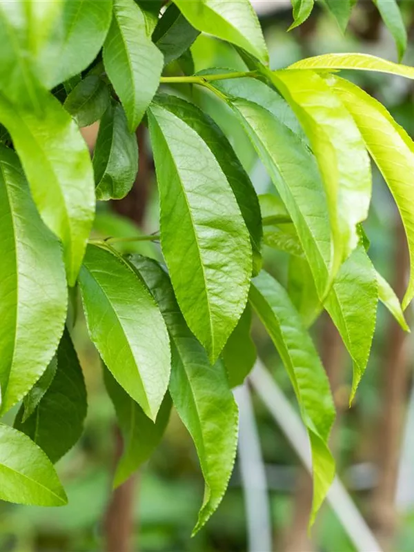 Die sommergrünen Blätter des Pfirsichs 'Kernechter vom Vorgebirge' sind mittelgrün, lanzettlich.
