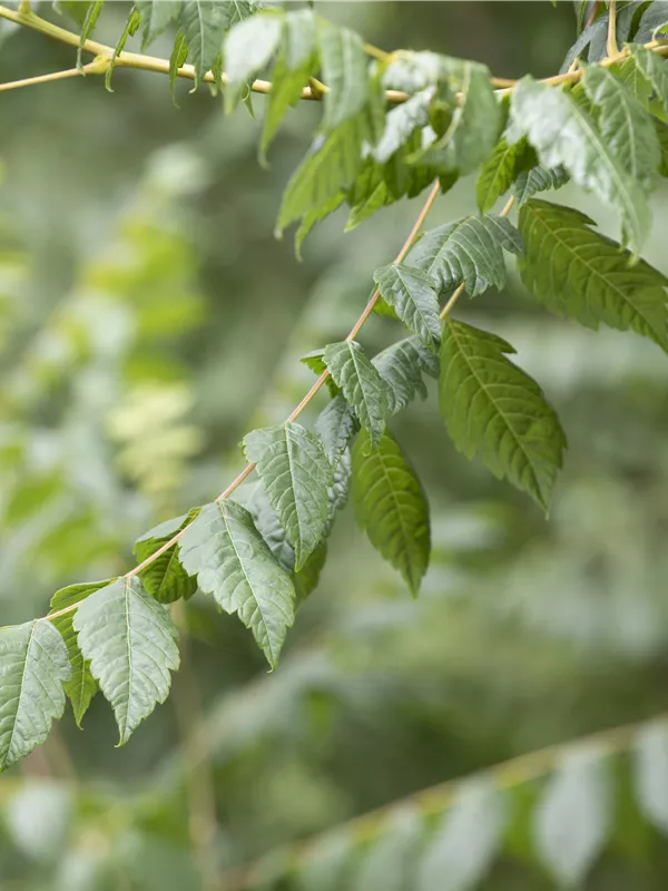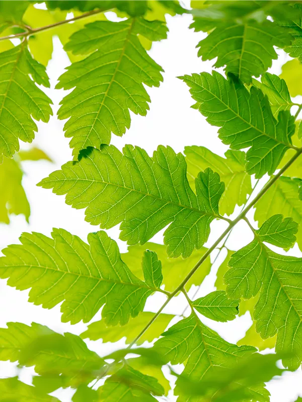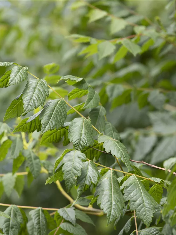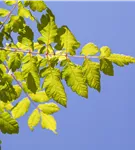 Die sommergrünen Blätter des Blasenbaums 'Coral Sun' sind dunkelgrün, gefiedert, gesägt. Diese sind etwa 20 - 25 cm groß. Roter Austrieb. Blasenbaum 'Coral Sun' zeigt sich leuchtend gelb-orange im Herbst.