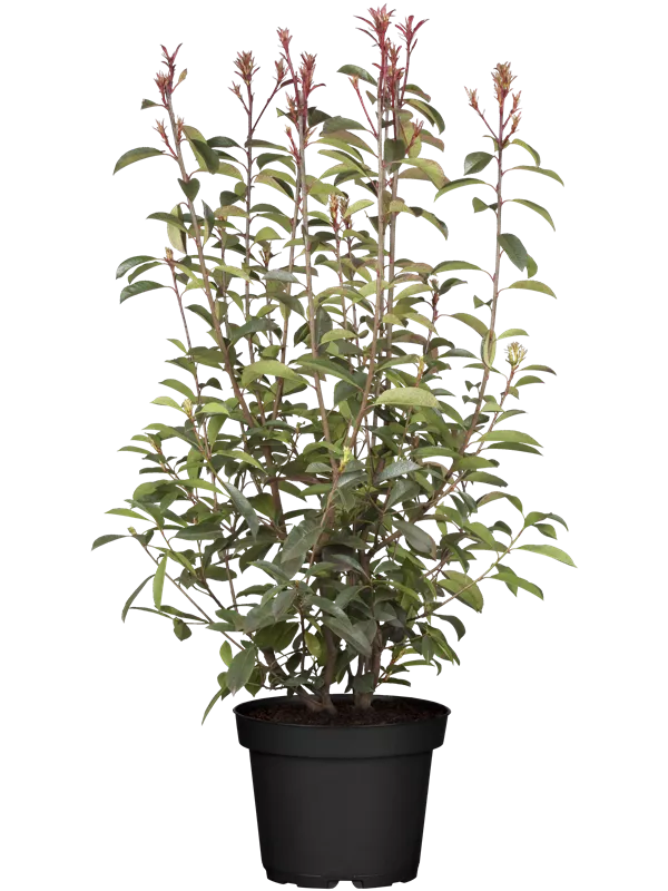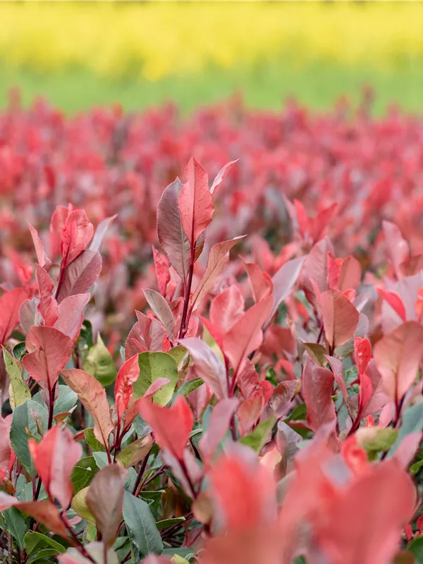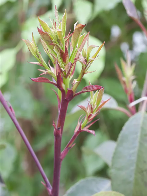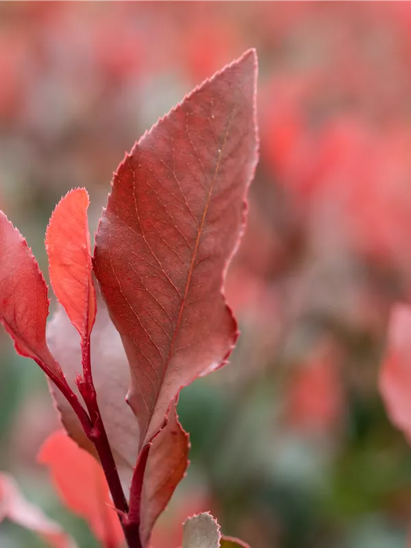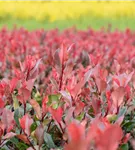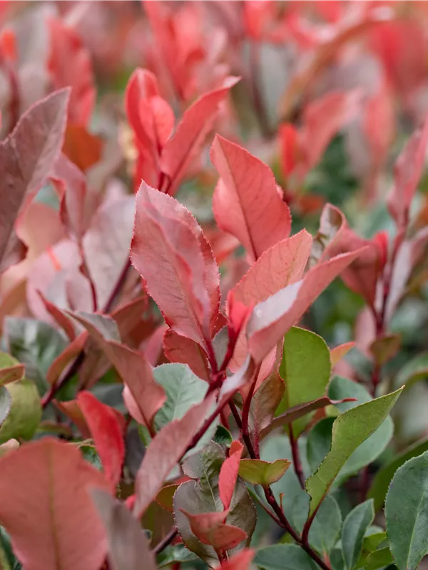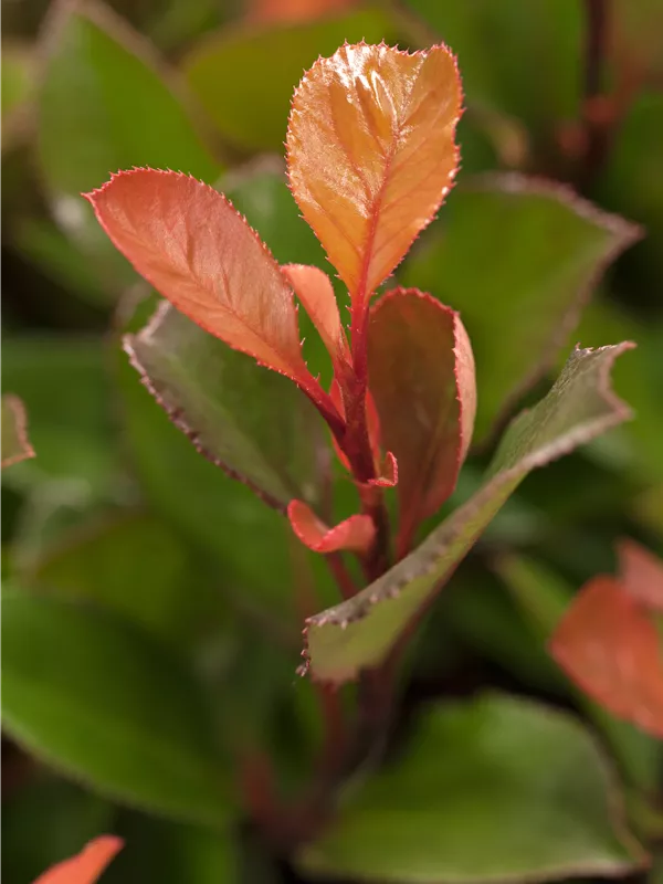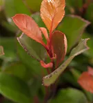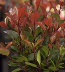 Die immergrünen Blätter der Glanzmispel 'Little Red Robin' sind dunkelgrün, lanzettlich, glänzend. Roter Austrieb.