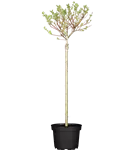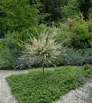 Hoher Blattschmuckwert. Die sommergrünen Blätter der Harlekin-Weide 'Hakuro Nishiki', Stamm sind grün-weiß. Diese sind etwa 3 - 7 cm groß. Weiß-rosafarbener Austrieb. Harlekin-Weide 'Hakuro Nishiki', Stamm zeigt sich leuchtend hellgelb im Herbst.