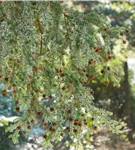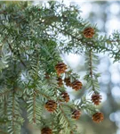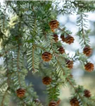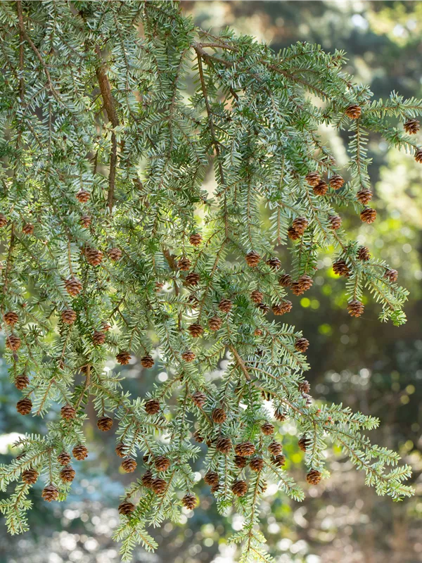 Die ovalen, braunen Zapfen von Tsuga canadensis erscheinen ab September. Die jungen Zapfen haben eine blau-grüne Färbung.
