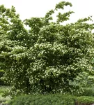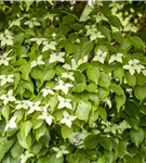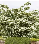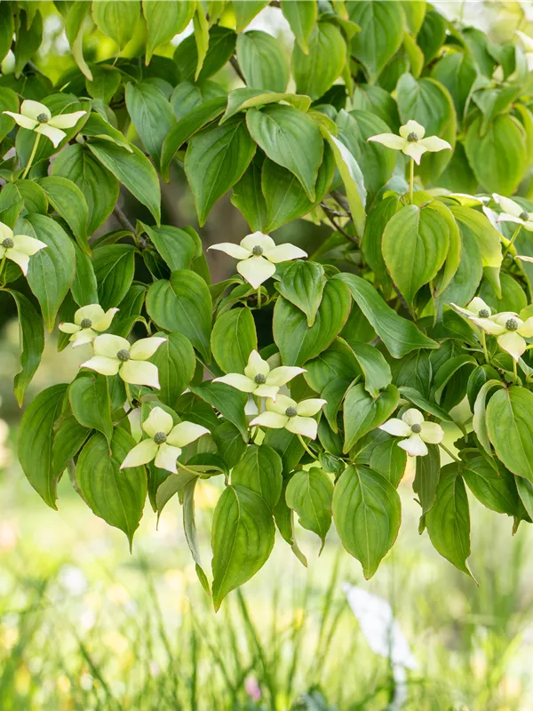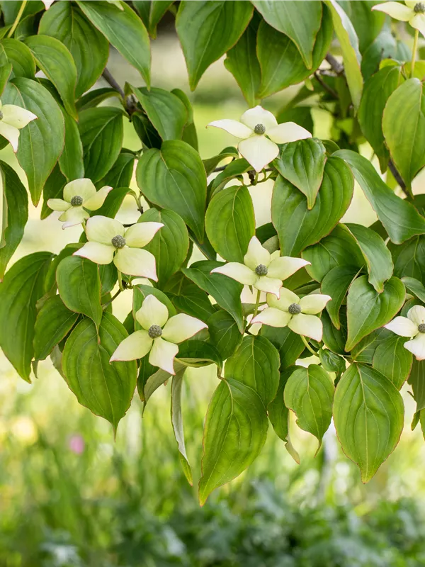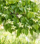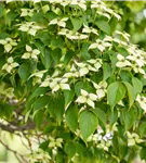 Die cremeweißen Blüten des Japanischen Blumen-Hartriegel 'Kreuzdame' erscheinen in Dolden von Mai bis Juni. Diese werden etwa 8 - 10 cm groß.
