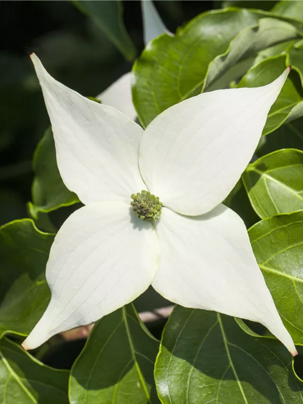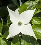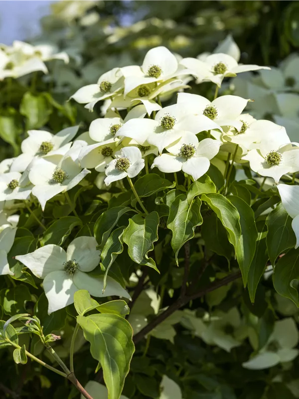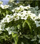 Die cremeweißen Blüten des Japanischen Blumen-Hartriegel 'Milky Way' erscheinen in Dolden von Ende Mai bis Juni. Diese werden etwa 8 - 12 cm groß.