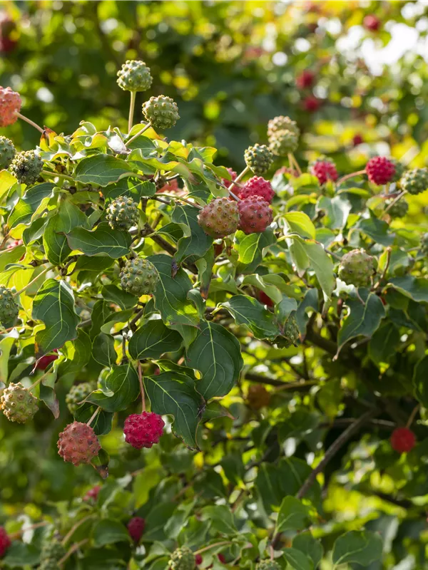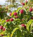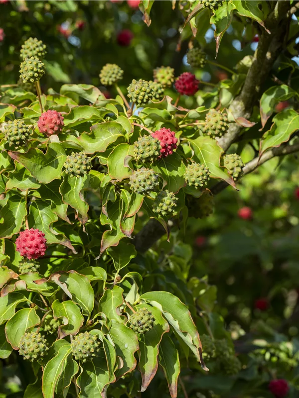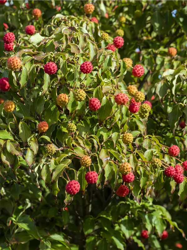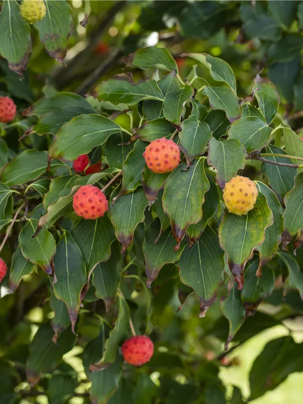 Besonders dekorativ sind die rosaroten Beeren von Cornus kousa chinensis 'Milky Way'. Diese erscheinen ab September.