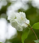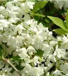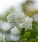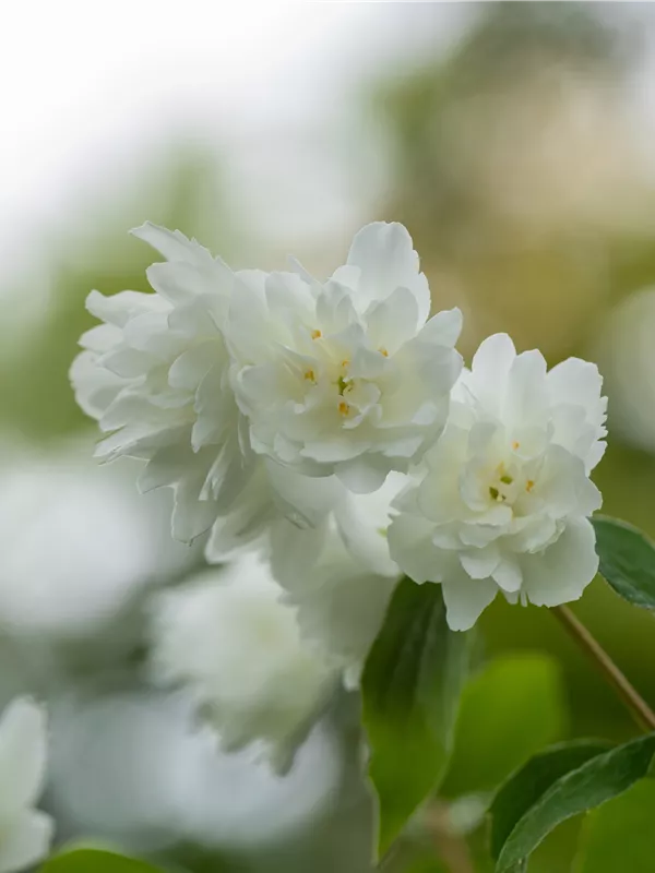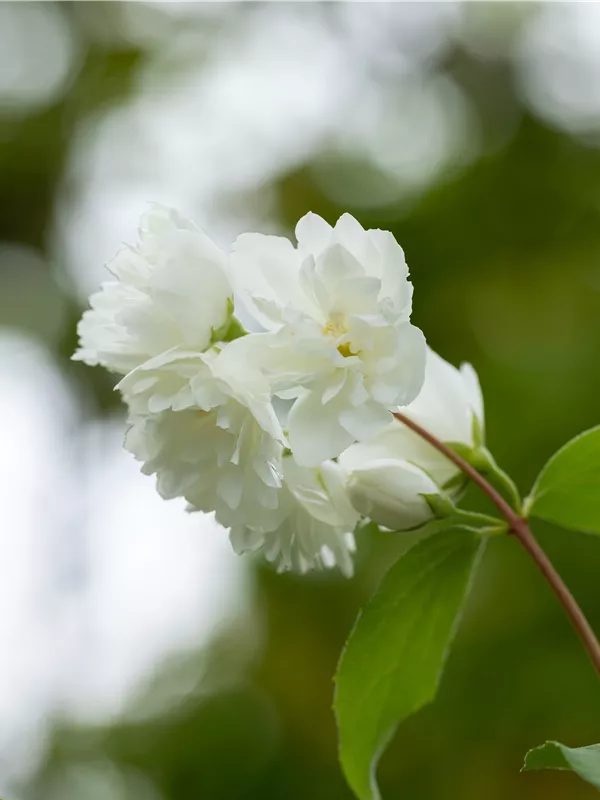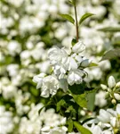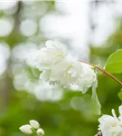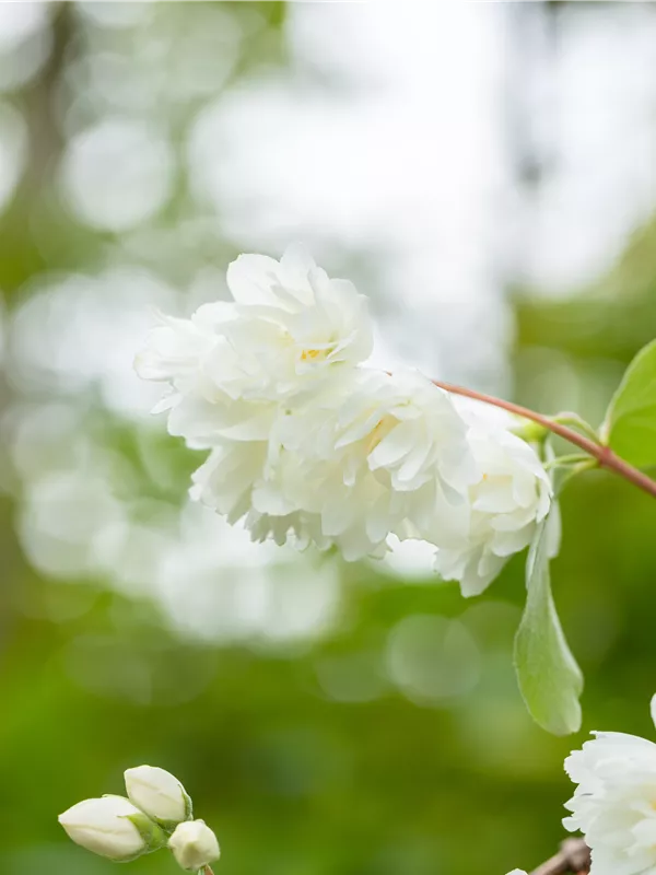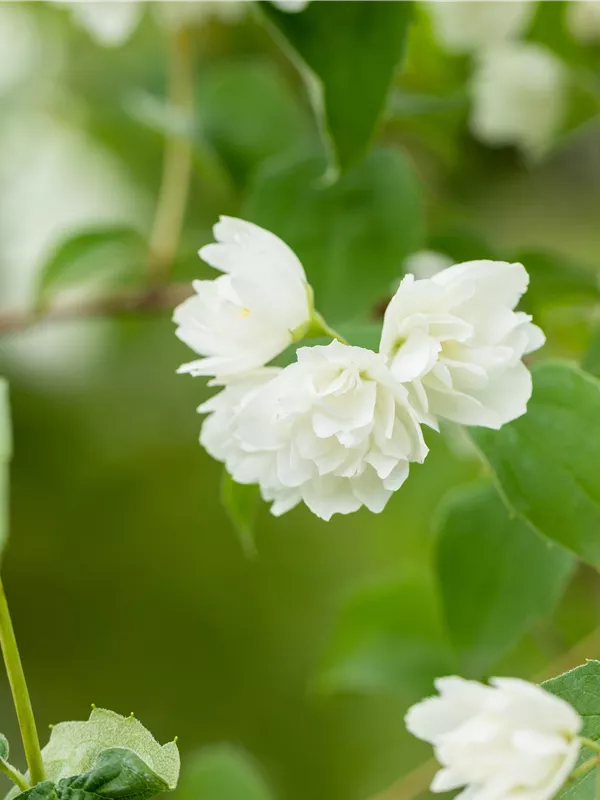 Die weißen, starkgefüllten, schalenförmigen Blüten des Gartenjasmin 'Schneesturm' erscheinen in Trauben von Juni bis Juli. Diese werden etwa 4 - 5 cm groß und sind stark duftend.