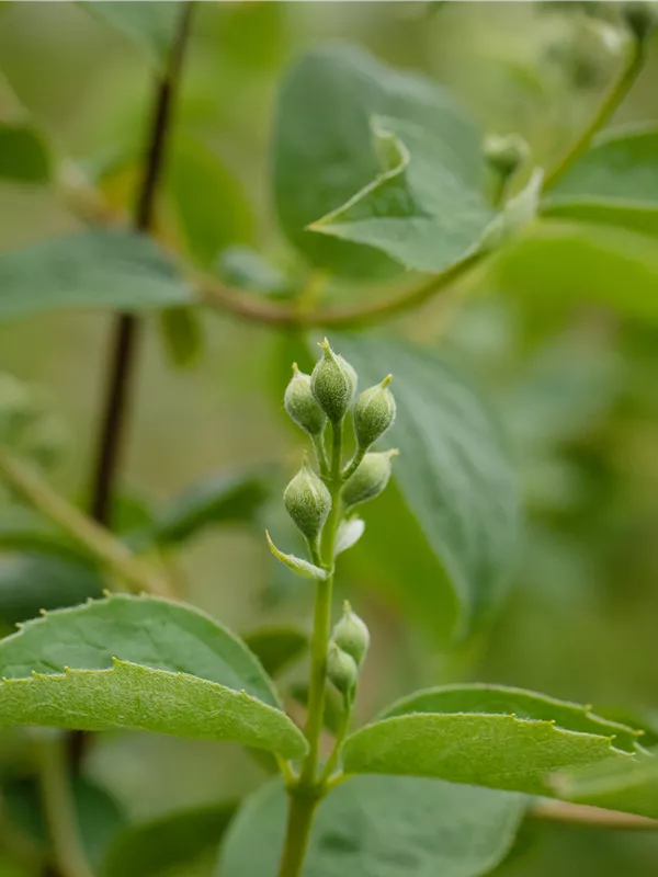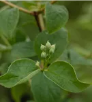 Die sommergrünen Blätter des Gartenjasmins 'Schneesturm' sind dunkelgrün, eiförmig, gegenständig. Diese sind etwa 3 - 5 cm groß.