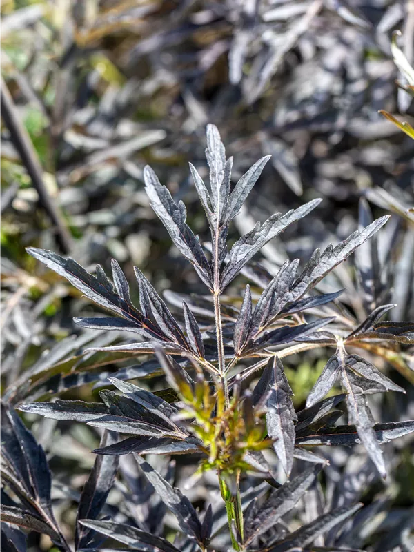 Hoher Blattschmuckwert. Die sommergrünen Blätter des Schwarzen Holunders 'Cherry Lace'® sind dunkelrot, tief geschlitzt, gegenständig. Grün-roter, früher Austrieb. Schwarzer Holunder 'Cherry Lace'® zeigt sich leuchtend gelb im Herbst. Lange haftend.