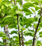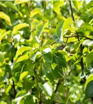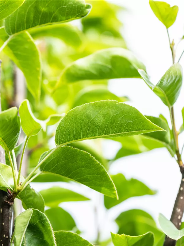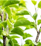 Die sommergrünen Blätter der Birne Nashi 'Hosui' sind mittelgrün. Diese sind etwa 7 - 12 cm groß.