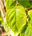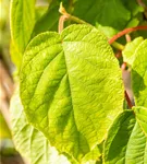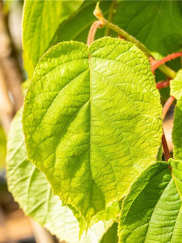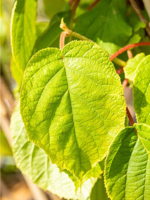 Die sommergrünen Blätter der Kiwi 'Solo' sind dunkelgrün, rundlich, wechselständig. Diese sind etwa 10 - 15 cm groß.