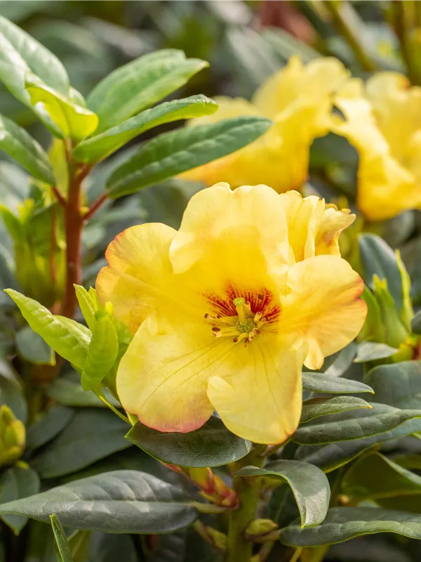 Der Rhododendron 'Golden Everest'®(s) ist immergrün und trägt dunkelgrüne lanzettliche Blätter.