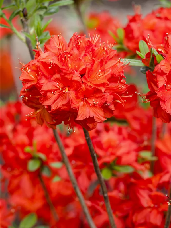 Die dunkelroten Blüten der Sommergrünen Azalee 'Nabucco' erscheinen in Dolden von Anfang Juni bis Ende Juni.