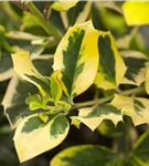 Die immergrünen Blätter der Gelbbunte Stechpalme 'Golden King' sind dunkelgrün, eiförmig, glänzend, wechselständig, gezähnt und weisen einen gelben Rand auf.