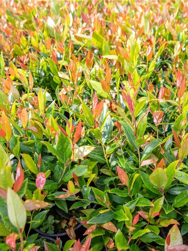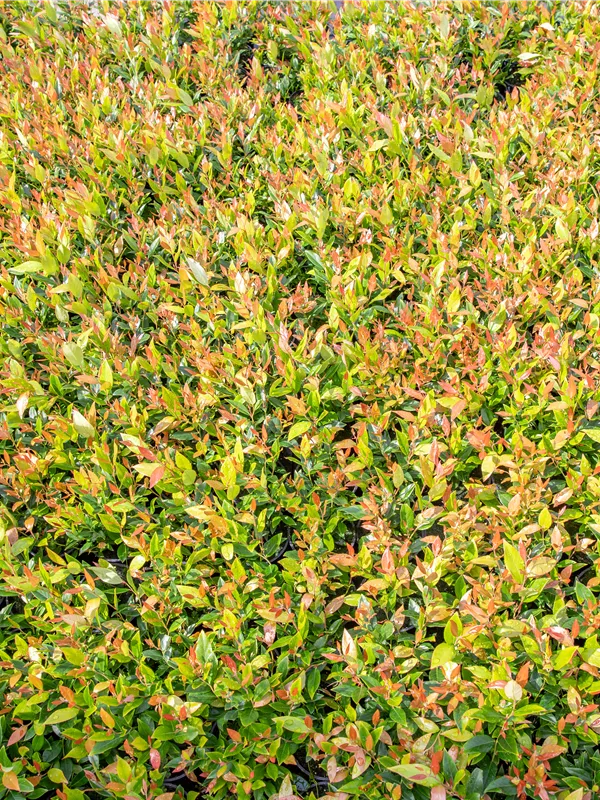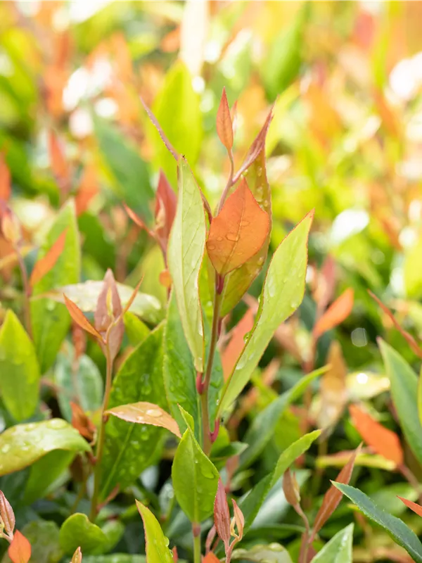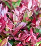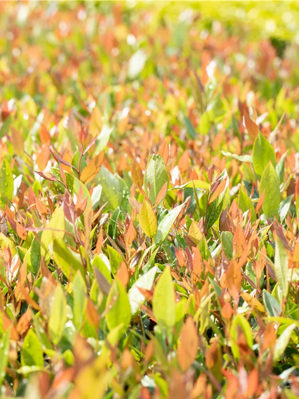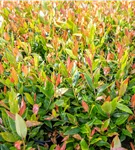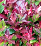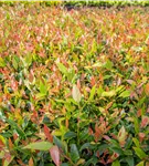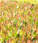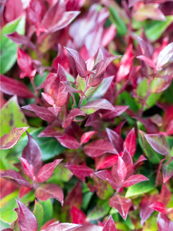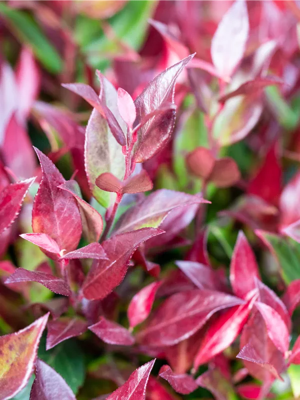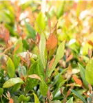 Die immergrünen Blätter der Traubenheide 'Little Flames' sind grün-rot, lanzettlich, glänzend, gezähnt.