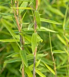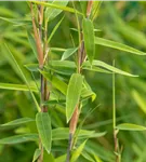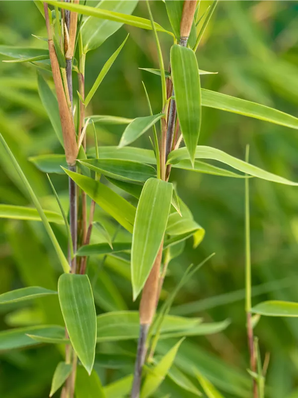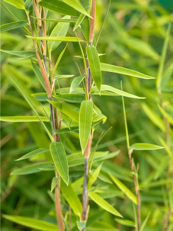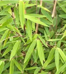 Hoher Blattschmuckwert. Die immergrünen Blätter des Bambuses 'Volcano' sind mittelgrün, lanzettlich.