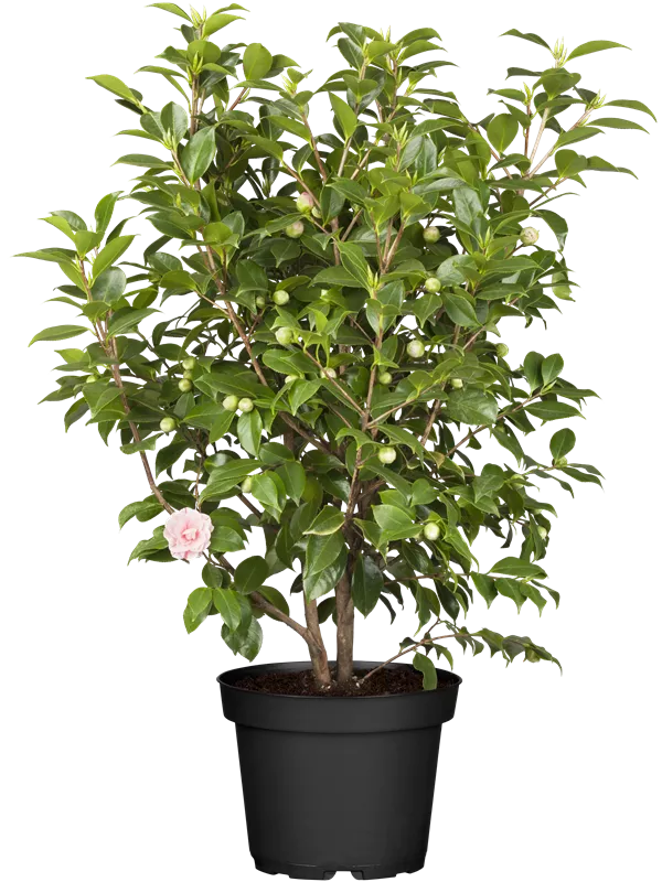 Kamelie 'Bonomiana' ist ein aufrecht wachsender Strauch, der eine Höhe von 2 - 3 m und eine Breite von 1,5 - 2 m erreichen kann.