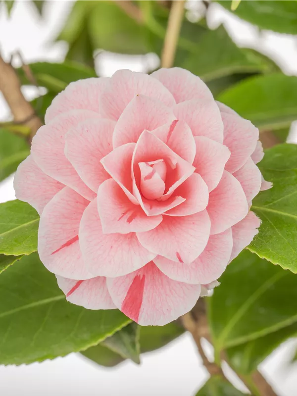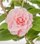 Camellia japonica 'Bonomiana' bildet gefüllte, rosafarbene Blüten ab Februar.