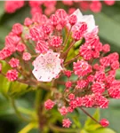 Die rot-weißen, schalenförmigen Blüten des Berglorbeer 'Peppermint' erscheinen in Doldentrauben im Juni.