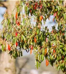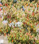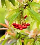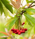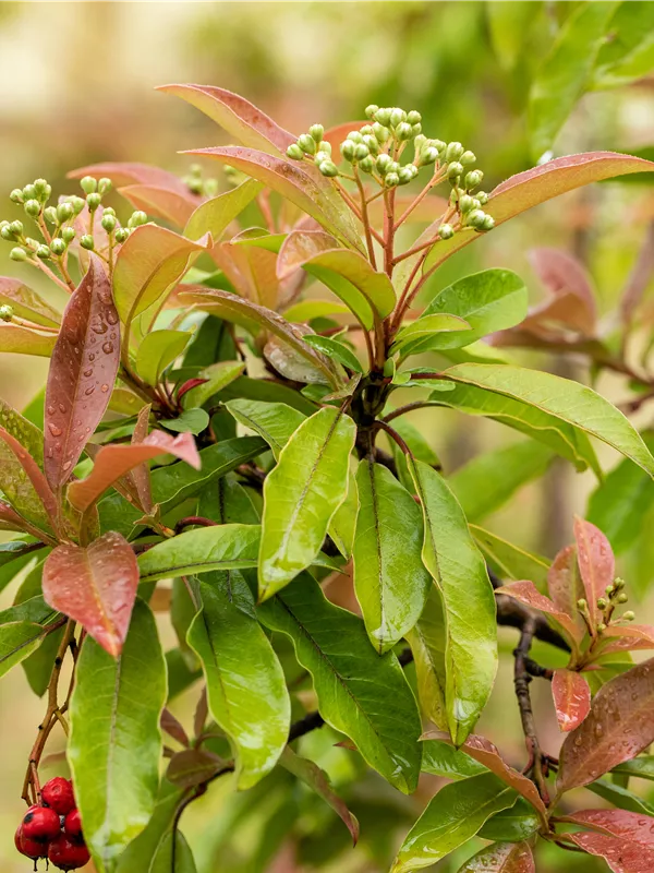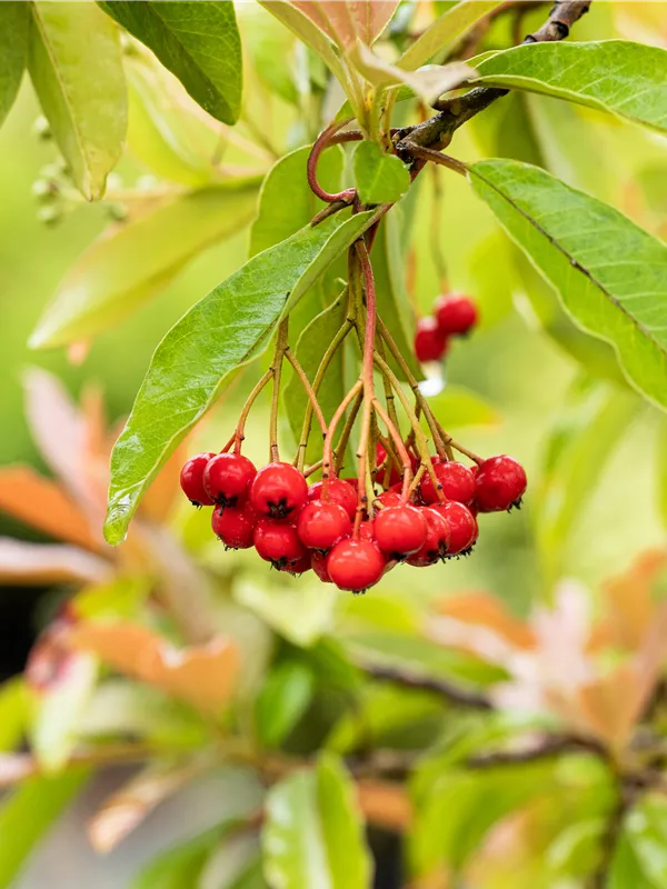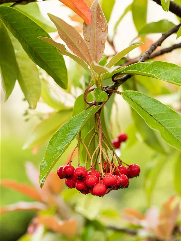 Besonders dekorativ sind die roten, runden Früchte von Photinia davidiana. Diese erscheinen ab September. Haften sehr lange.