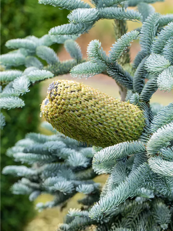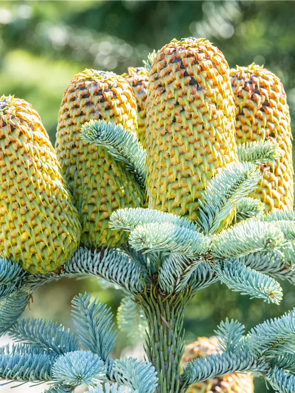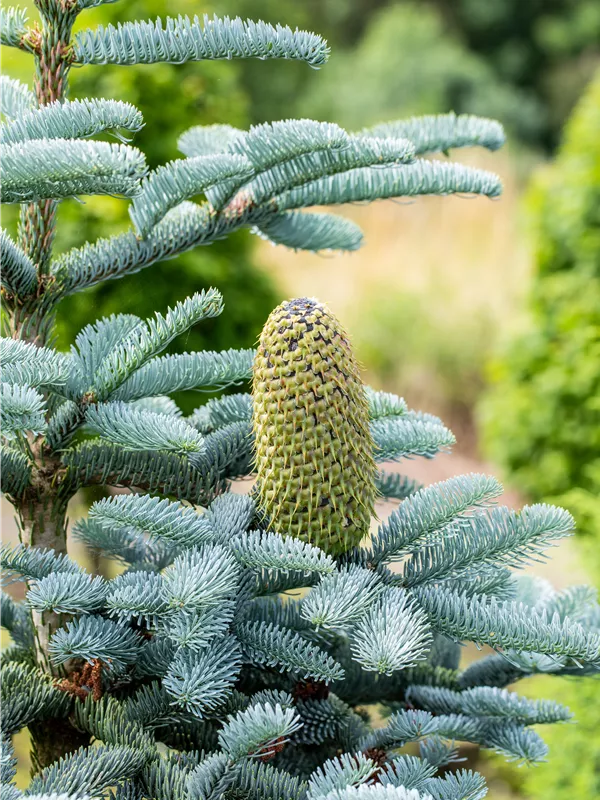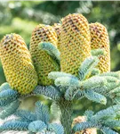 Besonders dekorativ sind die rot-braunen, zylindrischen Zapfen von Abies procera 'Glauca'. Diese erscheinen ab September und sind groß.Die jungen Zapfen haben eine grüne Färbung.